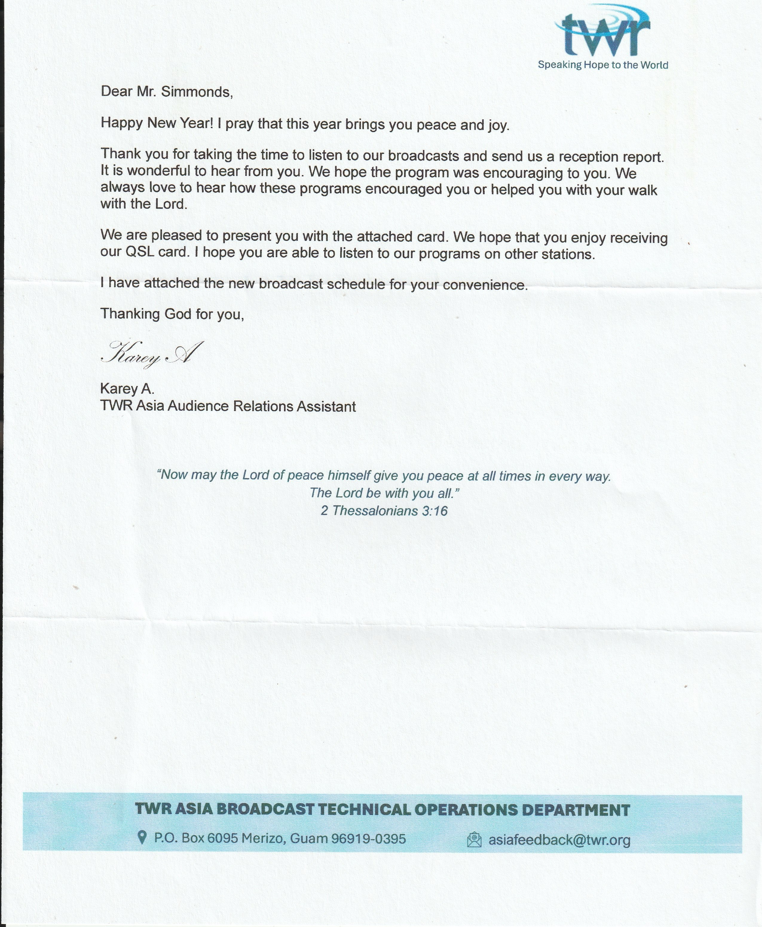 Last week, I received the QSL card below from KTWR Guam for my reception of their station on 15400 kHz on 20th August 2025.
