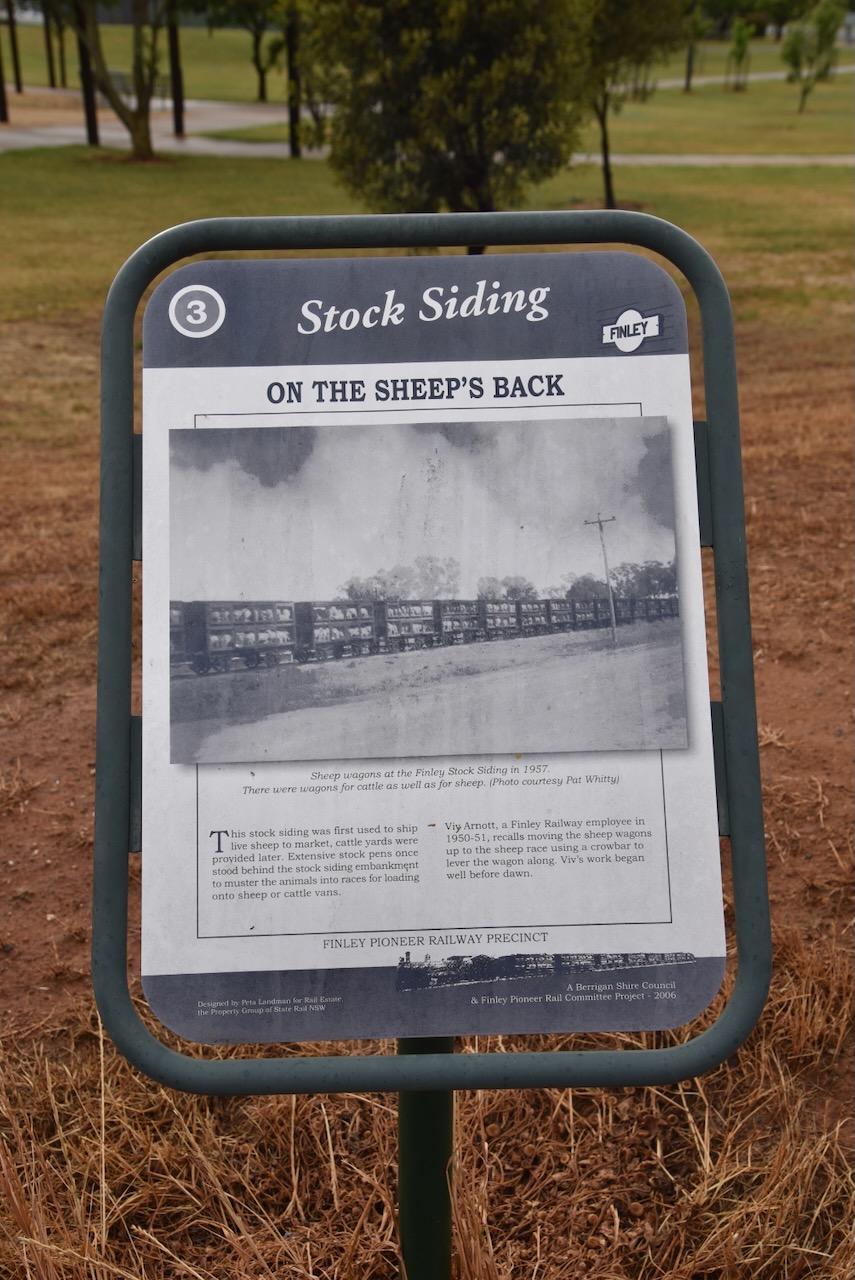 After having a quick drive around the town, Marija and I visited the Finley Railway Precinct. Unfortunately, the museum was closed. In Railway Park, you can view the old stock siding that was used to ship live sheep to market. They have been demolished now, but extensive stock pens once stood behind the stock siding embankment.