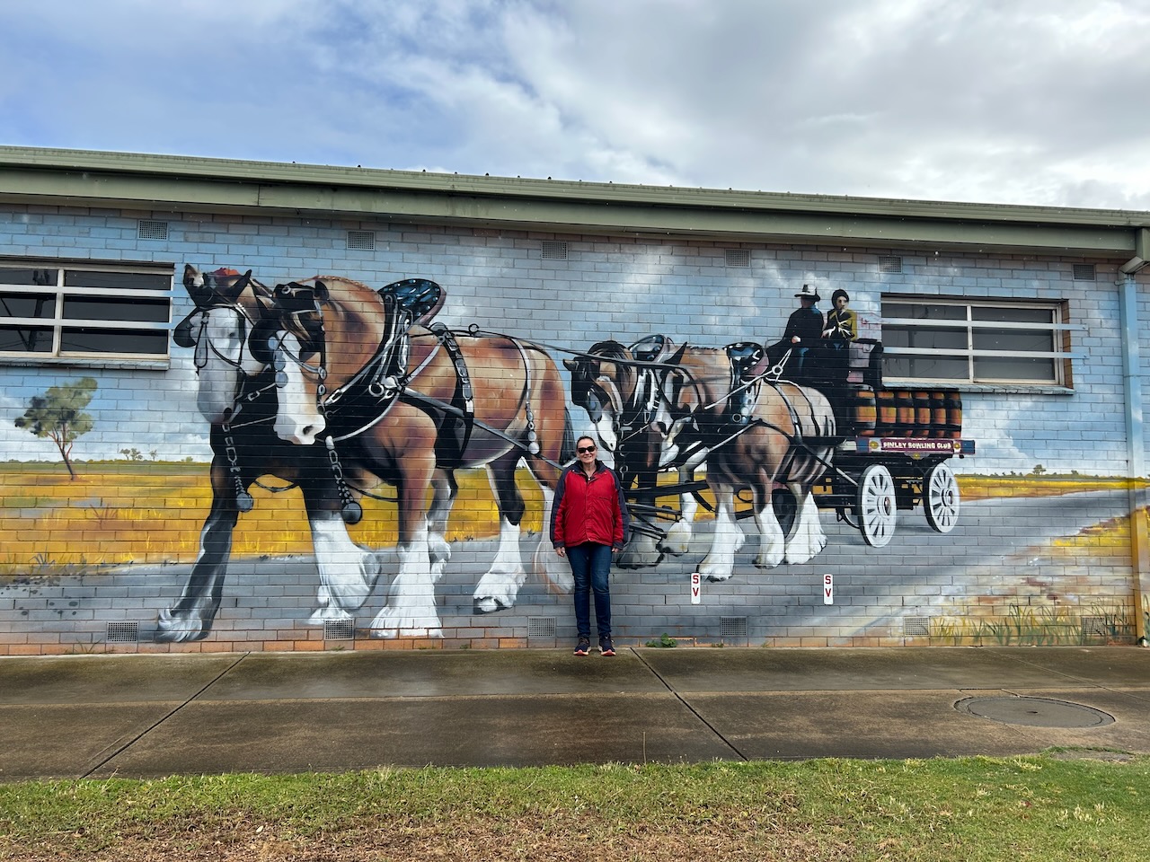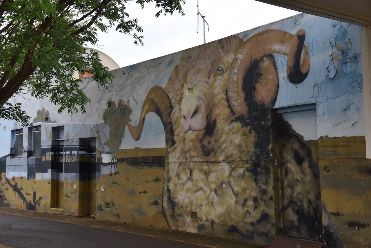 Other murals include a ram on the side of the Tuppal Hotel and Clydesdale horses at the Finley Bowling Club.