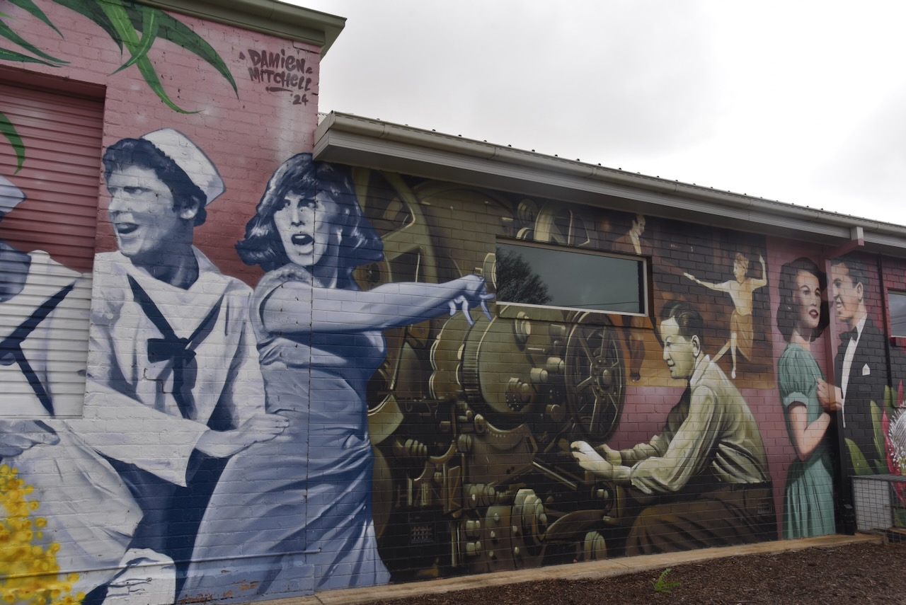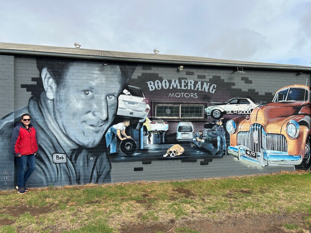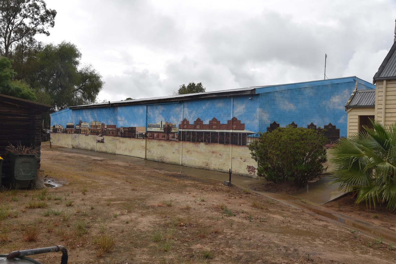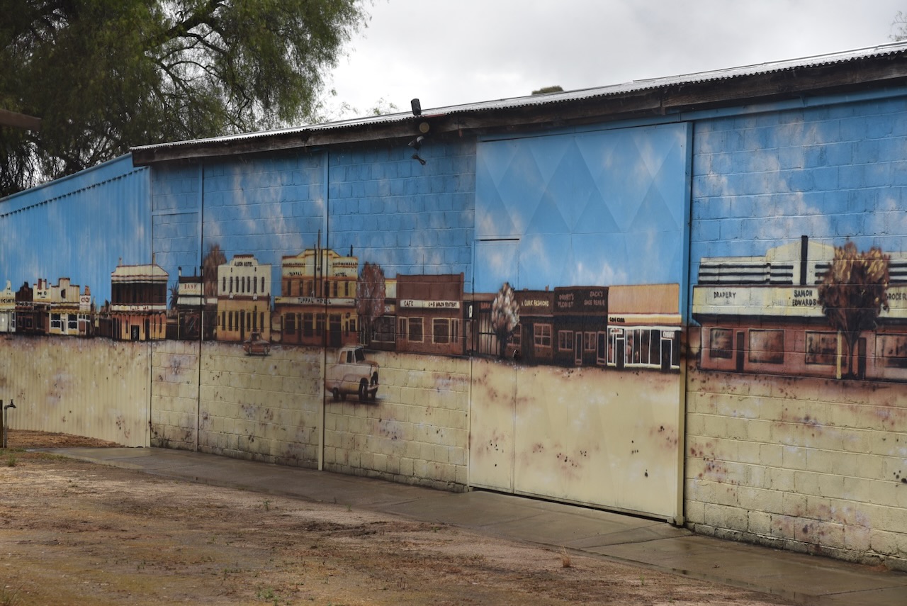 Opposite the railway siding in Endeavour Street is Boomerang Motors. On the side of the building is a magnificent mural, the work of Damien Mitchell. It is one of several murals in Finley. We even spoke with the son of the gentleman who features on the mural.