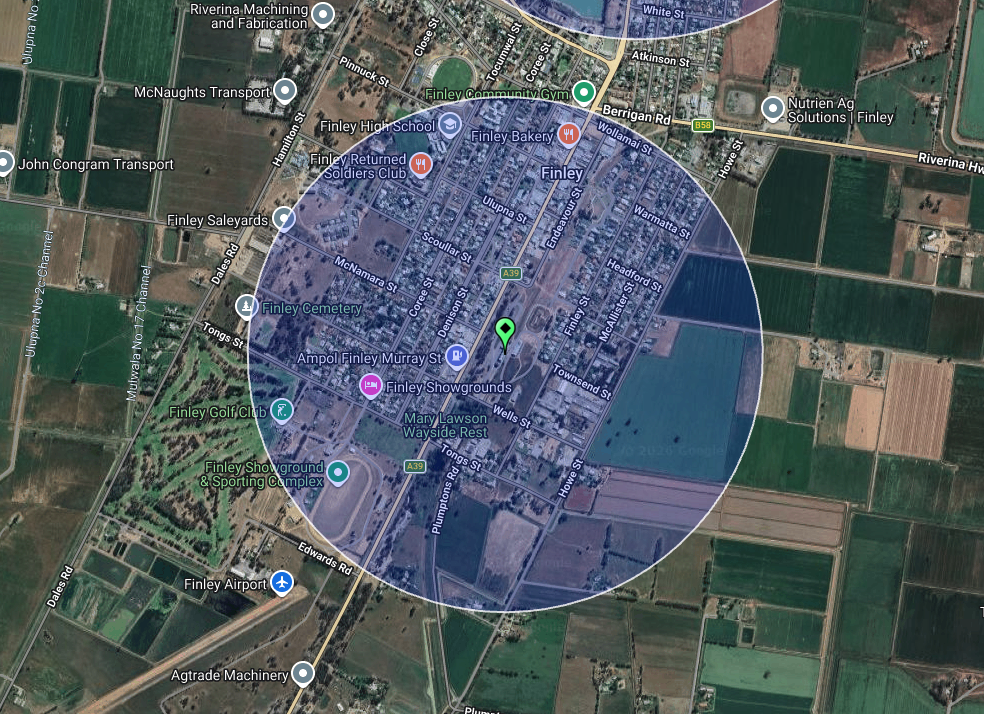 Above: Map showing the location of Finley, N.S.W. Map c/o Google Maps