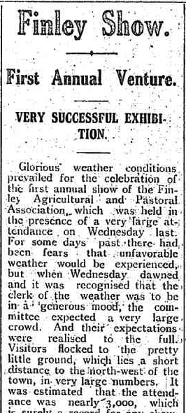 In 1912, the Finley Agricultural & Pastoral Association was established. The first agricultural show as held on the 17th day of September 1913. (Wikipedia 2021)