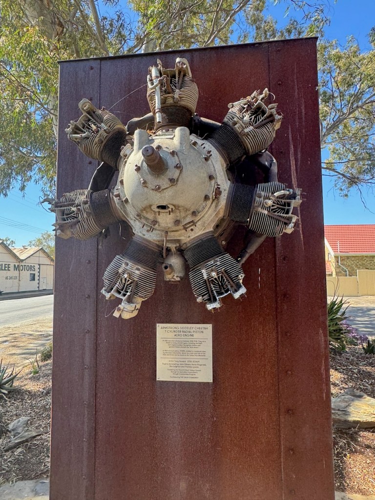 On display at the info bay is a sculpture which includes an Armstrong Siddeley Cheetah aero engine from an Avro Anson aircraft. Such an aircraft crashed in a field near Tarlee in 1943.