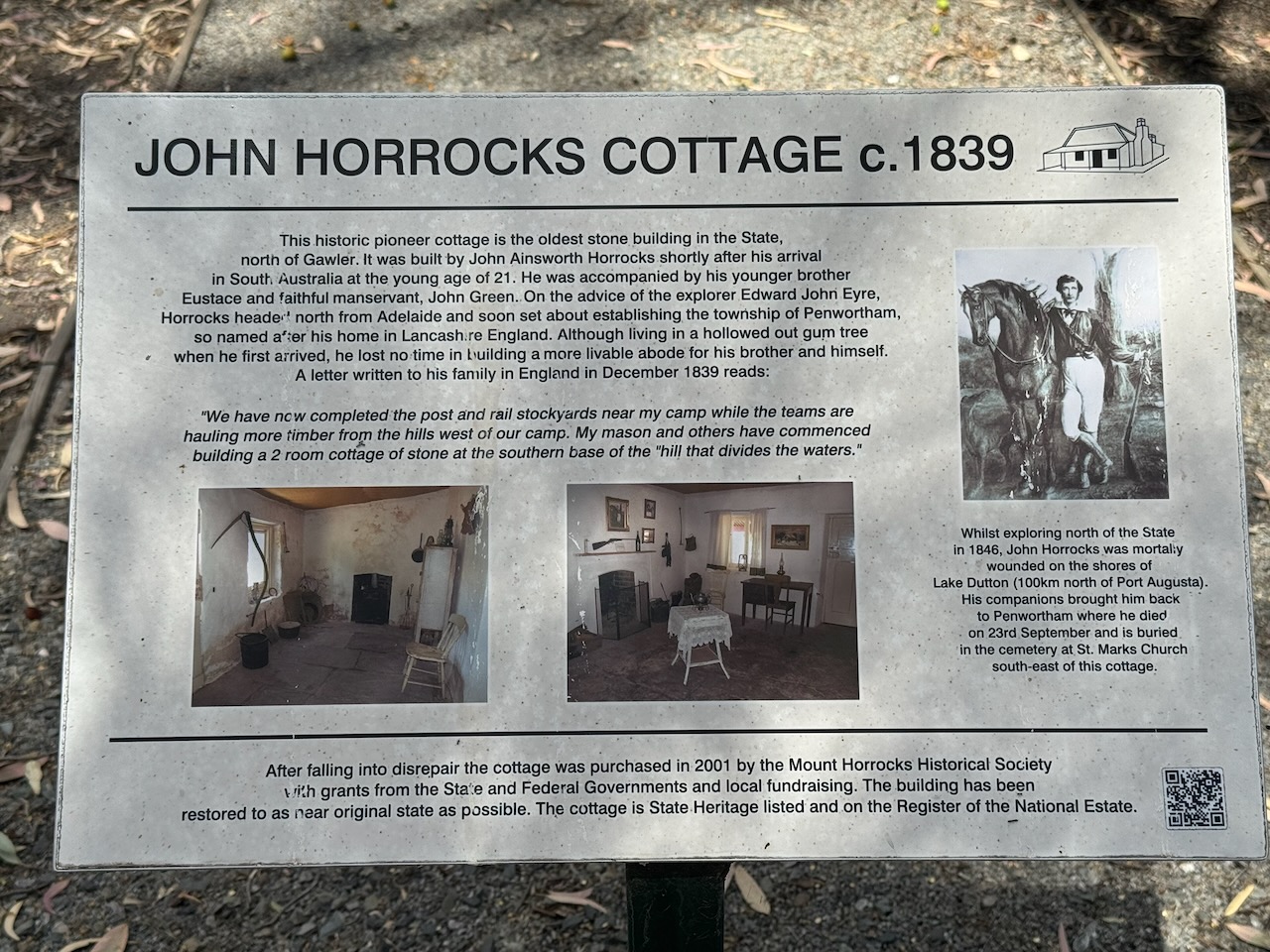 I headed south out of Clare on the Horrocks Highway and stopped at John Horrocks’ cottage at Penwortham, south of Clare. The Pioneer Cottage is the oldest stone building in South Australia, north of Gawler. It was built by the pastoralist and explorer John Ainsworth Horrocks shortly after he arrived in South Australia at the age of 21.