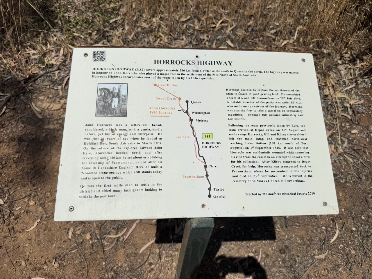 On the 1st day of September 1846, on the shores of Lake Dutton, about 100 km north of Port Augusta, Horrocks was accidentally shot whilst reloading his firearm. One barrel of the gun was tripped by the packload of a camel known as Harry whilst it was kneeling. Harry was the first camel to arrive in Australia. Horrocks was severely wounded, losing the middle finger of his right hand and a row of teeth from his upper right jaw. The expedition was cancelled, and the party returned to Penwortham, where Horrocks died from his wounds on the 23rd day of September 1846. (Wikipedia 2025)