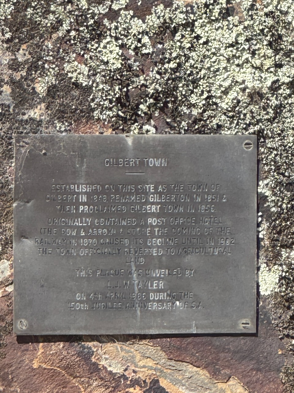 After the activation, I continued south on the Horrocks Highway, stopping at the monument for the former site of Gilbert Town, just north of Tarlee. The town was established in 1848 and was originally known as Gilbert. It was renamed Gilberton in 1851, and then in 1856 was proclaimed Gilber Town. The town once had a Post Office, the Bow & Arrow Hotel, and a store. The coming of the railway in 1870 caused the town’s decline, until 1902, when the town was officially reverted to agricultural land.