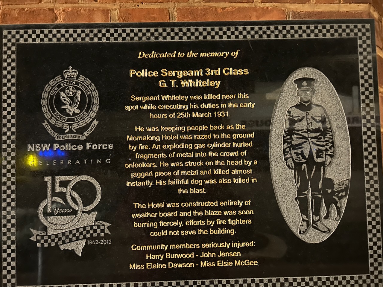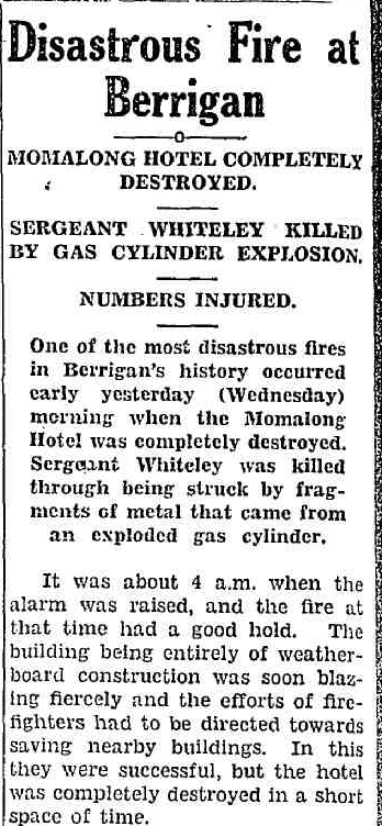 On the 25th day of March 1931, a major fire broke out at the Momalong Hotel. Sergeant First Class G.T. Whitely was keeping people back as the hotel was razed to the ground by fire. As he did so, an exploding gas cylinder hurled fragments of metal into the crowd of onlookers. Sadly, Sergeant Whiteley was struck on the head by a piece of jagged metal and was killed instantly. His faithful dog was also killed in the blast. Sergeant Whiteley was 43 years old. (Findagrave.com 2021) (Trove 2026)