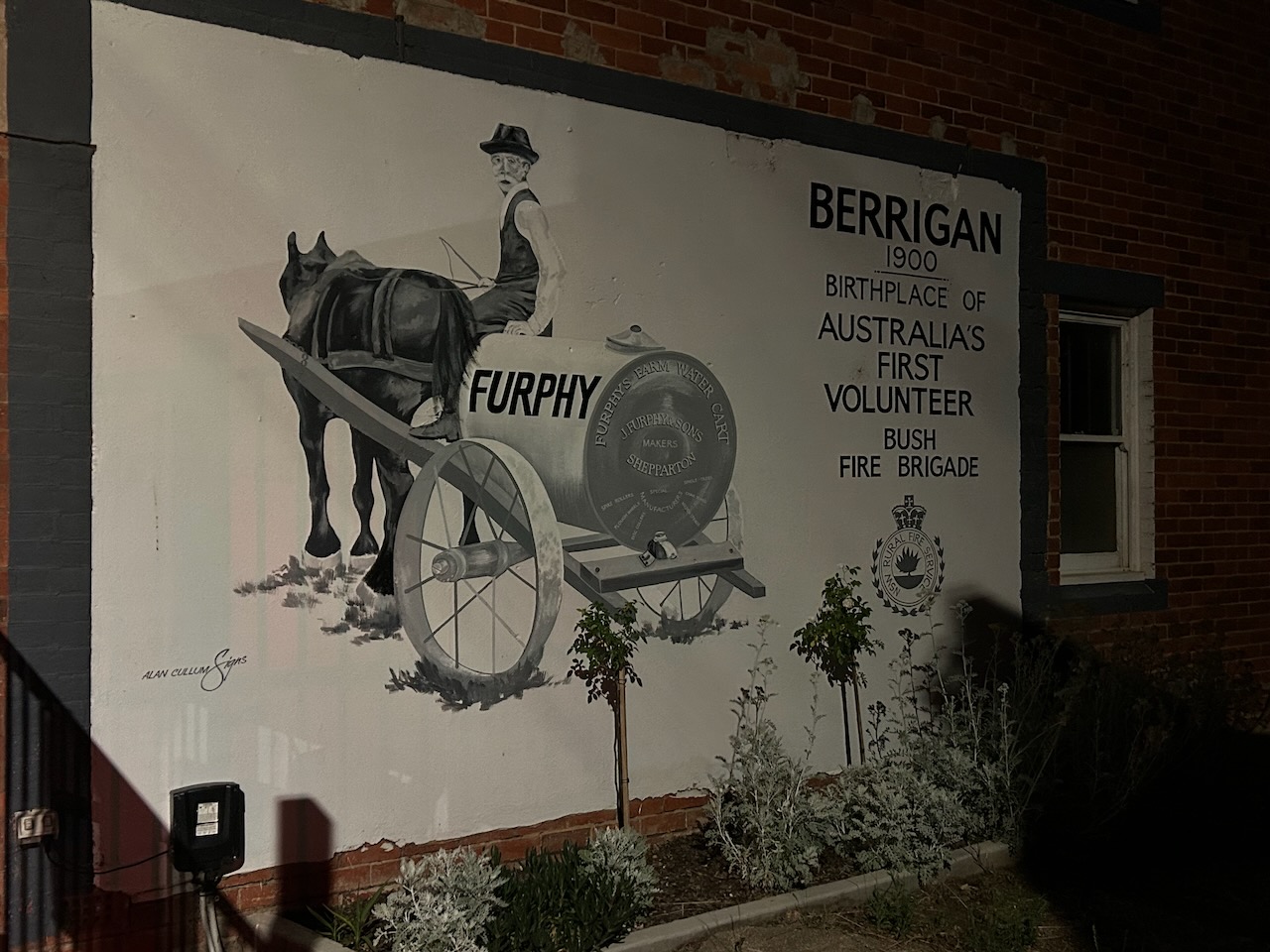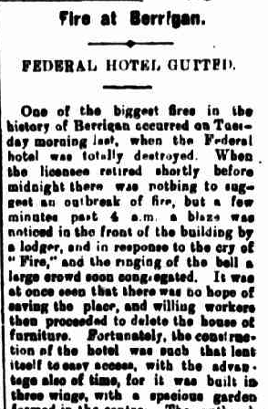 Berrigan saw several destructive building fires in the late 1890s and early 1900s. This included the Federal Hotel in 1897, several shops in 1897, the Australian Hall in 1899, the Roman Catholic Presbytery in 1901, the Federal Hotel in 1915, and the Momalong Hotel in 1931. Ironically, it was the birthplace of Australia’s first volunteer Bush Fire Brigade.