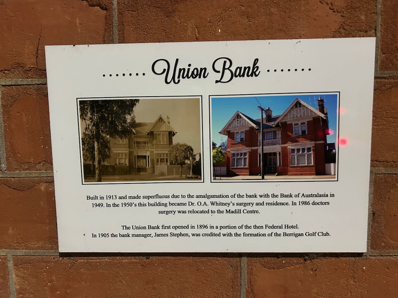The old Union Bank was built in 1913. It was made superfluous due to the amalgamation of the bank with the Bank of Australasia in 1949. During the 1950s, the building was used as a doctor’s surgery and residence by Dr O.A. Whitney.