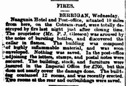 - Trove. (2026). A BIG BLAZE. – NANGUNIA HOTEL AND POST OFFICE DESTROYED BY FIRE. – The Berrigan Advocate (Cobram, NSW. : 1891 – 1970) – 16 Jan 1903. [online] Available at: https://trove.nla.gov.au/newspaper/article/266521467?searchTerm=nangunia%20hotel [Accessed 4 Apr. 2026].