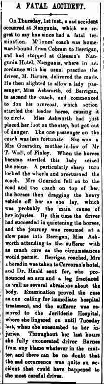 I found the newspaper article below from The Berrigan Advocate in May 1902. The coach was travelling from Cobram to Berrigan and stopped at Gleeson’s Hotel. The driver was assisting a female passenger to alight when the leader horse was startled, and the coach overturned. Another lady in the coach was thrown from the coach, which fell on top of her, and was then dragged along the road by the horses. The coach continued to Berrigan, with medical aid being provided to the lady. Upon arrival in Berrigan, it was established that she had sustained a fractured arm and leg. She was taken to the Jerilderie Hospital, but sadly died from her injuries. (Trove 2026)
