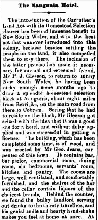 During the 1890s, a coach service was established between Cobram in Victoria and Berrigan in New South Wales. It was at this time, in 1896, that Gleeson’s Nangunia Hotel was built for Mr Patrick Gleeson. It took its name from Nangunia Station, a pastoral lease that was established in 1865. The hotel was constructed from timber and was built by Mr. Geoffrey Jeans, a carpenter from Berrigan. In April 1897, The Berrigan Advocate newspaper described the hotel as having a bar, bar parlour, commercial room, dining room, six bedrooms, servant’s room, kitchen and pantry. It stated that ‘the shelves of the bar and the cellar contain liquors of the choicest brands…….Behind the counter, we found the bulky landlord serving out drinks to the thirsty travellers and his genial smile and hearty hand-shake makes you feel at home at once.” (Berrigan 2025) (Facebook 2020)