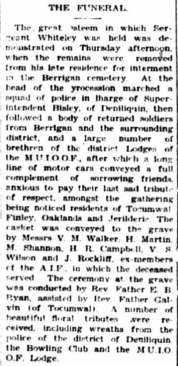 Sergeant Whiteley’s funeral took place on Thursday, the 26th day of March 1931. A squad of police marched at the head of the procession in charge of Superintendent Bisley of Deniliquin. This was followed by a body of returned soldiers from Berrigan and the surrounding district. They were followed by a large number of brethren from district Lodges, followed by a long line of motor vehicles containing family and friends. (Trove 2026)