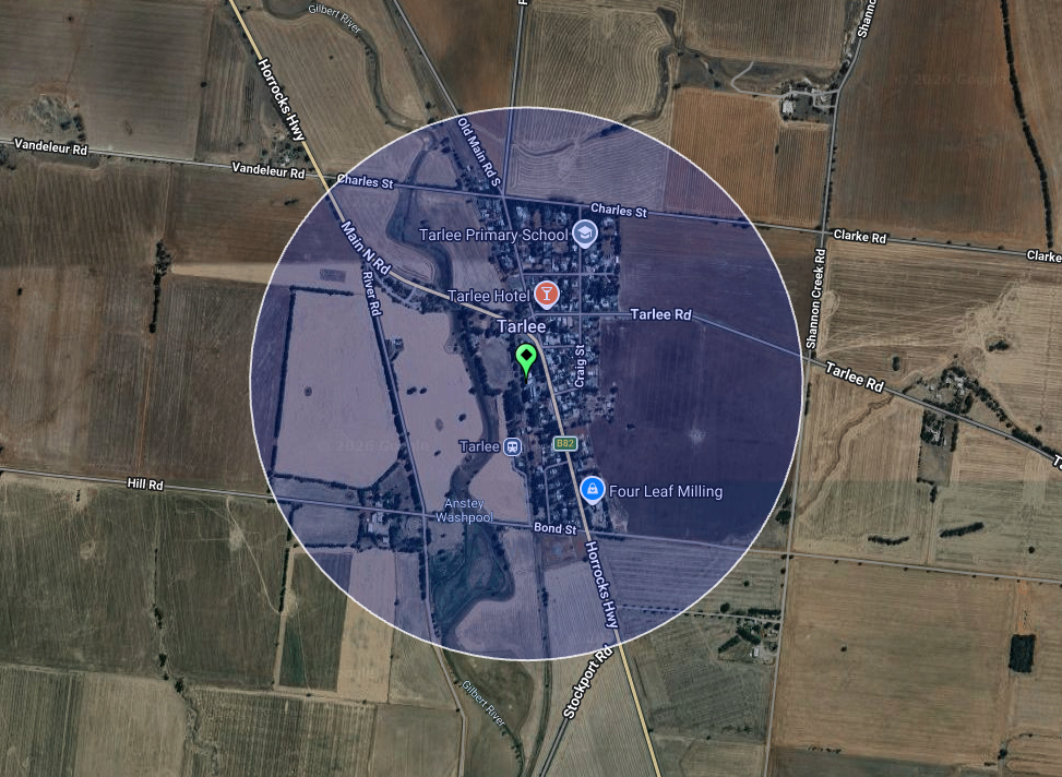 Tarlee is believed to derive from Tralee in Ireland. The town is located about 8km south of Giles Corner, where the Barrier Highway to Broken Hill diverges from the Horrocks Highway to the beautiful Clare Valley. (Wikipedia 2025)