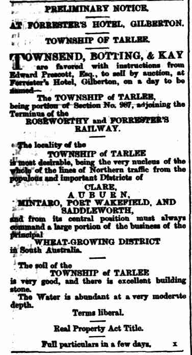 In June 1867, it was announced that the town of Tarlee was ready for sale by auction. It was to occur at Forrester’s Hotel at Gilberton. The locality was described as ‘most desirable, being the very nucleus of the whole of the lines of Northern traffic from the populous and important districts of Clare, Auburn, Mintaro, Port Wakefield and Saddleworth.‘ (Trove 2026) (Wikipedia 2025)