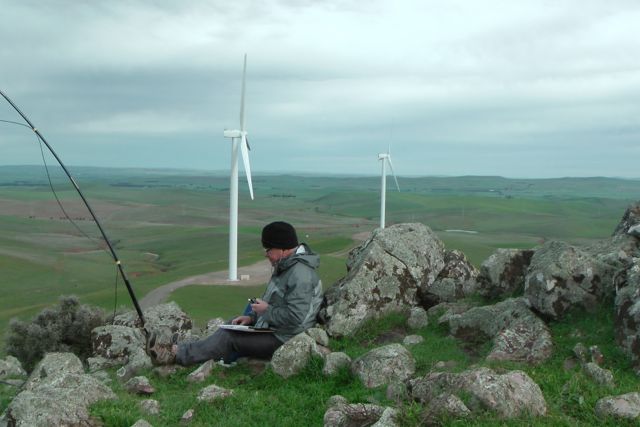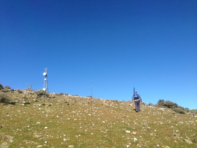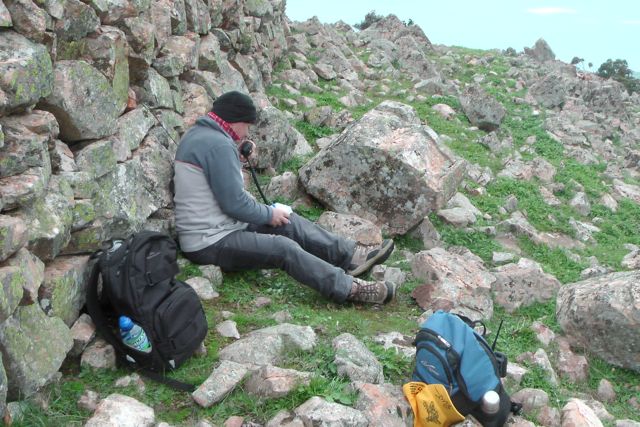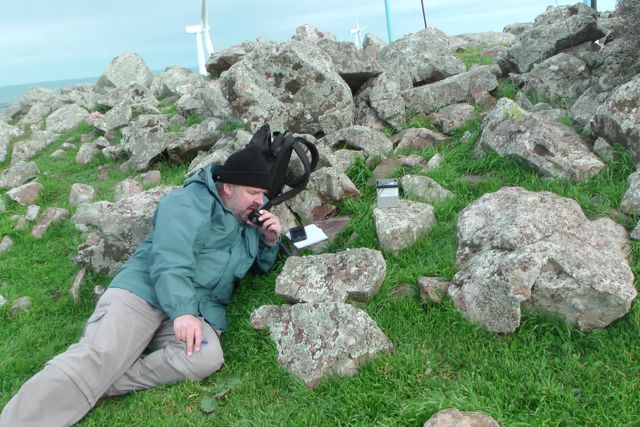 Going from the experience the day before with the squid pole snapping twice, we knew that today’s winds were just as bad as yesterday morning’s winds, so we looked around carefully for an operating spot. We walked down to a little gully just down from the trig point and this seemed to afford quite a bit of protection from the very strong winds.
