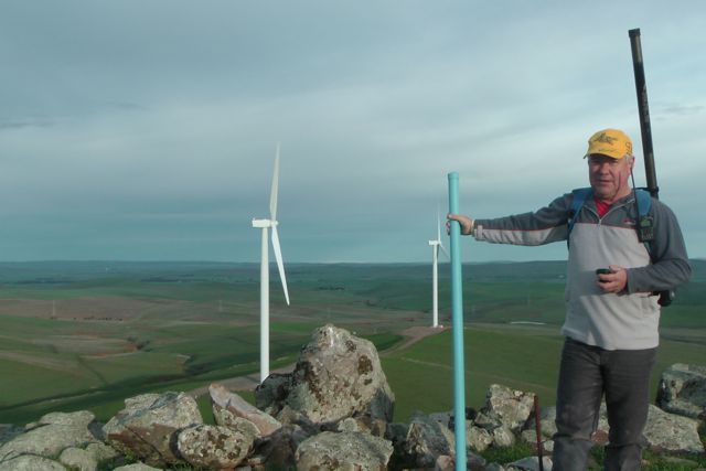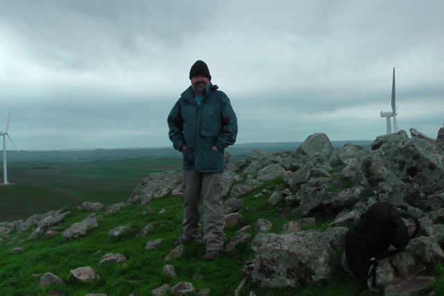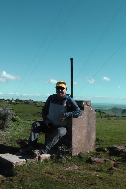 Ian and I parked the car about 1 km from the summit and climbed up a steep side of the hill to reach the trig point. It was a beautiful sunny day but blowing an absolute gale.