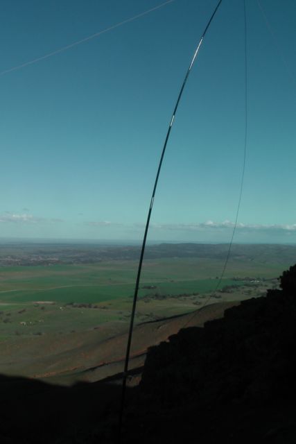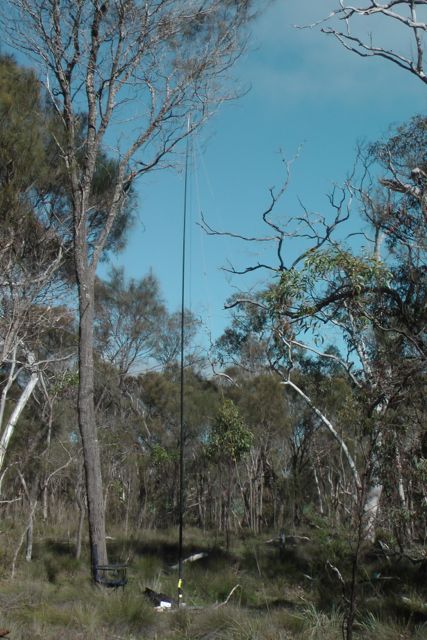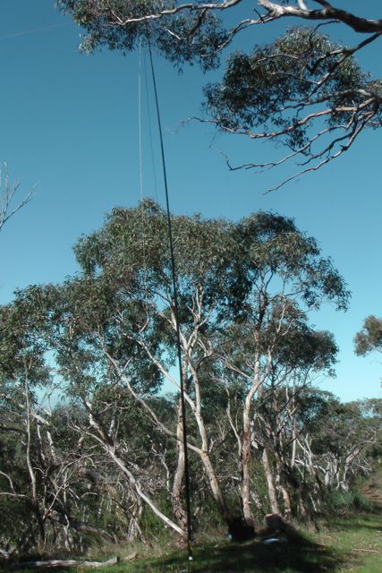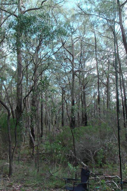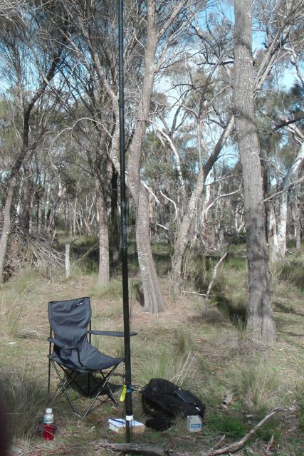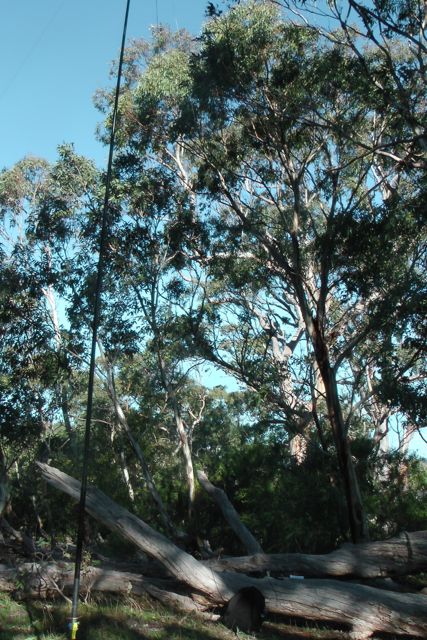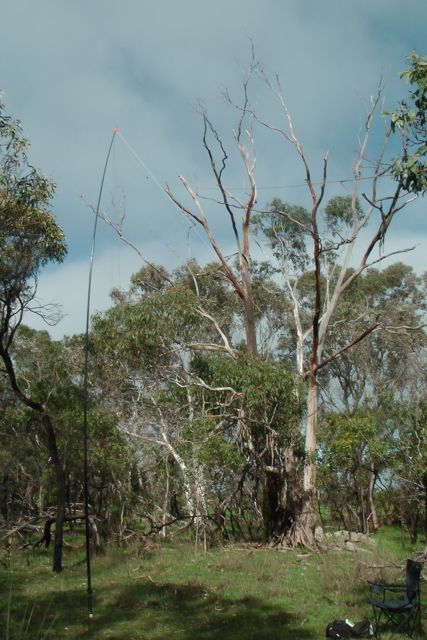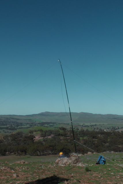 We set up the squid pole, attaching it to a Heysen trail sign post, using the octopus straps, and we then attached the 40m/20m linked dipole, weighing down the ends with some rocks. The wind was so strong that the legs of the dipole went flying into the air on at least two occasions.