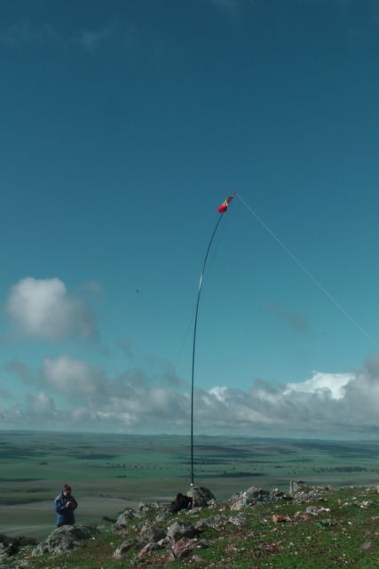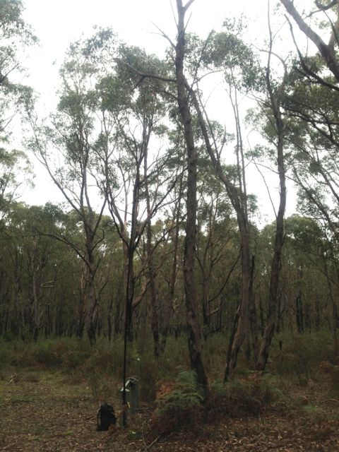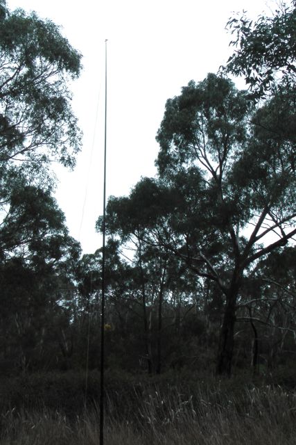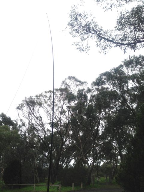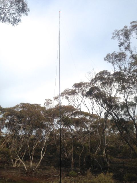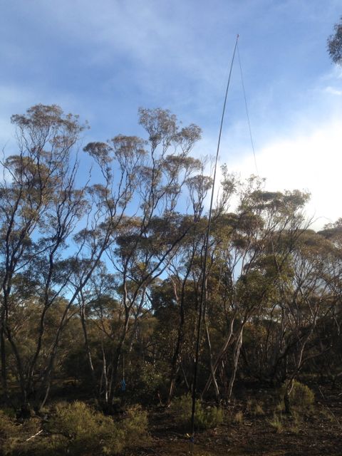 The Lowan Conservation Park is about 660 hectares in size and is located about 15 kms south of Bow Hill, a little town situated on the Murray River. Lowan Conservation Park is a reserve of remnant mallee scrub in the midst of wheat and sheep farms. The park consists of thick mallee scrub and areas of native pine and open grassland. Numerous bird species can be found in the park, including the Malleefowl, which is an endangered species. Malleefowl are also known as Lowan, and the park derives its name from the bird. Western grey kangaroos are also common and it is a good place to see short-beaked Echidnas, and fat tailed dunnarts if you are lucky. There are no marked tracks in the park and the mallee is very thick in parts, so a compass or GPS device is definitely needed. There are no facilities and no marked campground. I set up the dipole supported by the squid pole in a clearing amongst the mallee. The soil was very sandy so I was able to hammer in the squid pole holder and secure the squid pole to it with an octopus strap. There was no shortage of trees here to tie off the legs of the dipole.