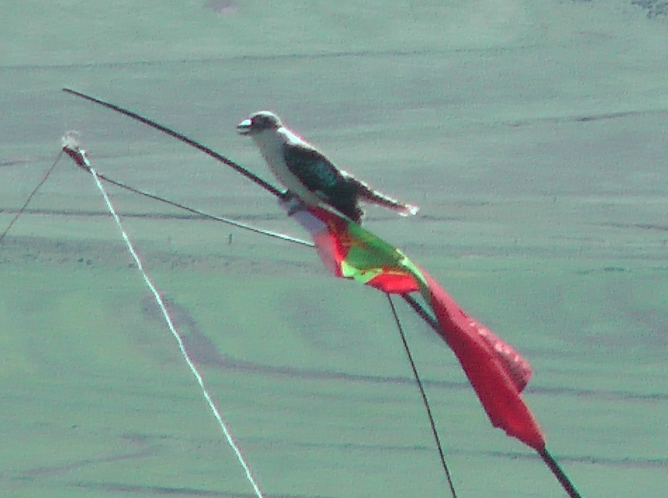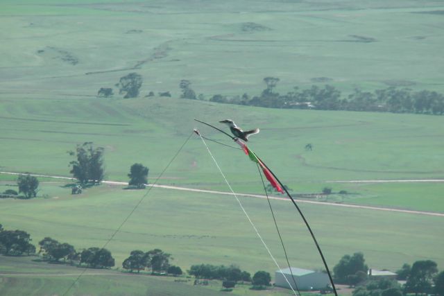 After a little over 30 minutes of exploring the summit, I started walking back towards our operating position and saw a rather large bird fly onto the top of the squid pole. I was in the process of taking a photograph when I saw the bird fly in. I was just far enough away that I couldn’t really tell what type of bird it was, so I zoomed in with the video camera and saw that it was a cheeky kookaburra that had decided to perch itself on the top of the squid pole, a few feet from where Ian was operating. As I got a bit closer, he/she decided to fly off, and as it did it let out its distinctive laughing call. It wasn’t until I got back to our operating spot, that Ian said he had noticed a drop in signal strength and that he hadn’t seen the bird.