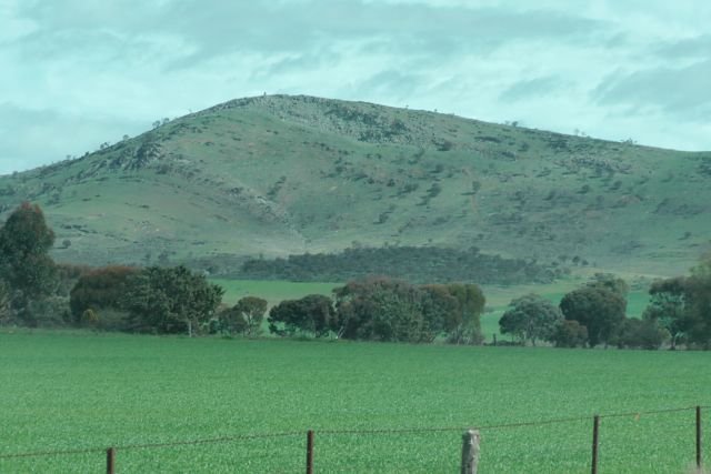 I parked my Falcon just inside the gate, and Ian and I then drove through the mallee scrub and into the paddock following the track alongside the creekline. There was a large number of ewes in the paddock with their lambs. Many of those were very young. We reached a fenceline at the western end of the paddock, and parked the 4WD here and unloaded our backpacks from the car. We then scrambled over the barbed wire fence, ensuring we didn’t do ourselves an injury in the process. We walked the rest of the way to the summit, a distance of about 1 km.