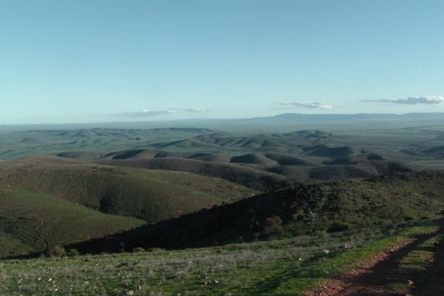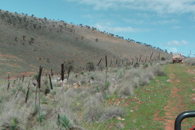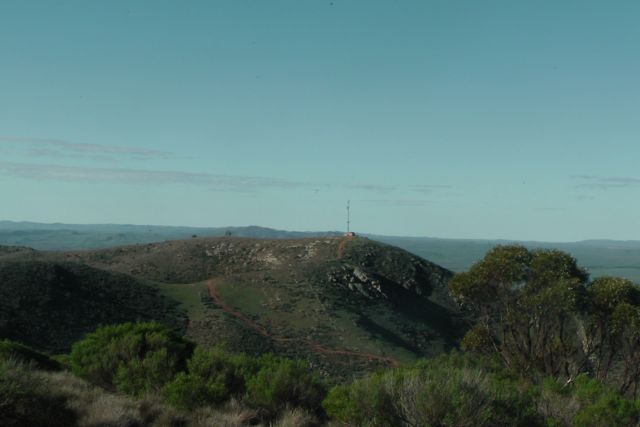 We met Tony at a gate on the new bitumen road between Pekina and Wepowie. There is an old pumping station here with a windmill lying on its side. I parked my Ford Falcon just inside the gate and jumped into Ian’s 4WD. From here, Tony led us through his paddocks, and then up a 4WD track which followed a saddle between the summit and an adjacent hill. When the track started to get rough, Tony kindly allowed us onto the back tray of his 4WD and we were driven up closer to the summit itself. Otherwidee the climb would have taken hours. On the drive up, there were numerous kangaroos and euros (wallaroos) seen.