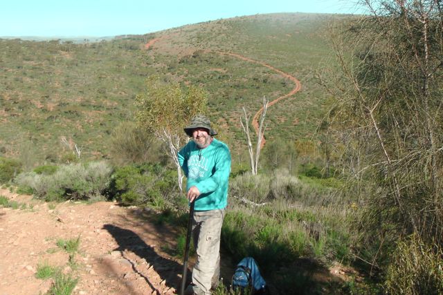 Ian and I continued to follow the dirt 4WD track alongside the old dingo fence and then up along the ridgeline. The track is rocky so it is slow going, but the views are amazing. We reached a point in the valley where the 4WD track continues on up to the Stokes Hill summit. We had driven a distance of about 4 kms along the track. We parked Ian’s 4WD here and made the rest of the way up the very steep 4WD track to the summit on foot. A distance of about 3 km walking, and it was not easy !