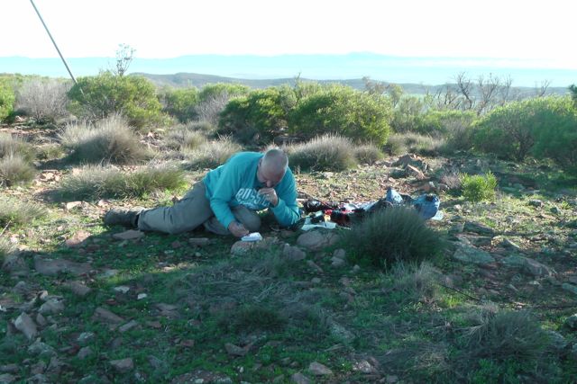 Andy I parked the car on the Playford Highway and walked 100 metres or so to the south, into the thick scrub of the park. We found a clearing and this is where we decided to set up, as there was a bit of room to stretch out the antenna. We didn’t want to go to far, because the weather was very threatening. As much as I wanted to test out my new bothy bag, the thought of cuddling up close to Andy in an enclosed space didn’t really appeal.