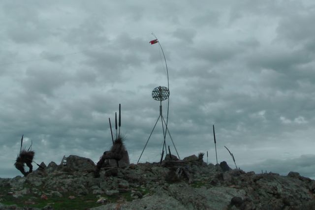 Ian and I set up right alongside of the trig point. We utilised part of the old wooden hut as protection from the wind which was roaring in from the west. The day’s eathr had changed from bright sunshine to an overcast afternoon with the threat of some rain. There was a convenient star dropper which we utilised to secure the 7 metre squid pole to with some octopus straps.
