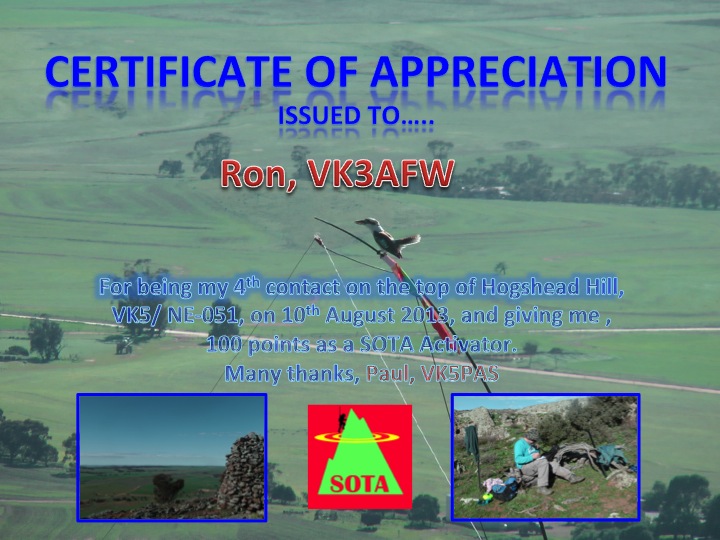 On Sunday morning, my 4th QSO on Hogshead Hill, VK5/ NE-051, was with Ron, VK3AFW. By working Ron I qualified for the summit, and in turn surpassed the 100 point mark as an Activator. I have applied for the certificate from SOTA and really look forward to receiving it.