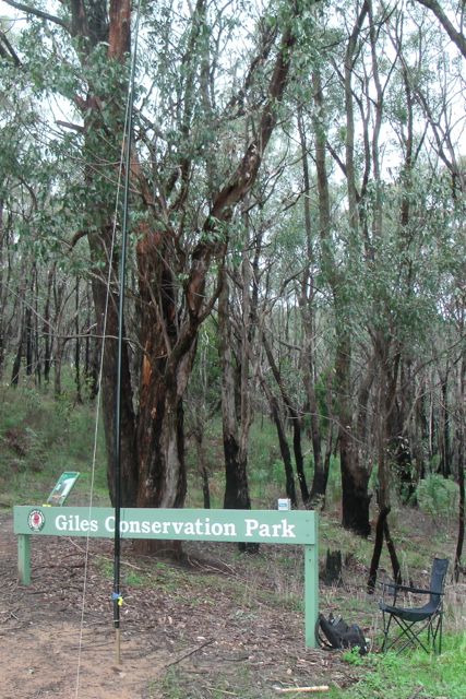 I found a fallen log and used this as a seat, and also to prop the 7 m squid pole against, and secured it with some octopus straps. My i-phone was bleating at me from the SOTA Goat application, so I was keen to get the antenna up and get on air. There were plenty of options in the park re stringing up the ends of the dipole. Lots of tall gum trees.