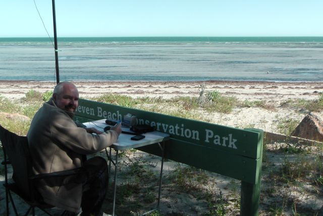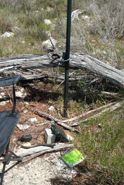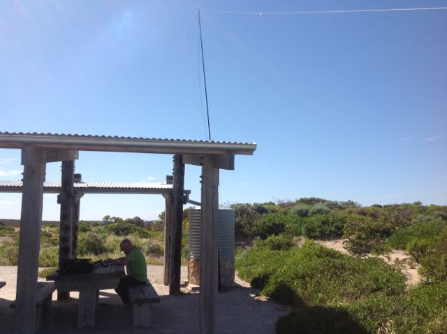 I set up up at the end of Roe Road, near Couch Beach, on the western end of the Park. There was a convenient car park at the end of Roe Road, and an even more convenient park sign, which I used to secure my 7m squid pole to with some octopus straps. It was a warm morning (already 28 deg C) with a stiff breeze coming off the ocean, but I managed to get some shade out of the hot sun. I set up my deck chair and fold up table, and put a call out on 7.095 on 40m, to be greeted by John VK5BJE, my first contact in the park. This was followed by a good signal from Allen VK3HRA who was setting up for JOTA, Tim VK5AV with a very strong signal from the SE of S.A., and Colin VK3UBY and his wife Sandra VK3LSC from Mildura. They always have a booming signal coming in from the Sunraysia district.