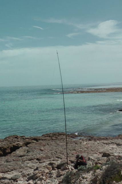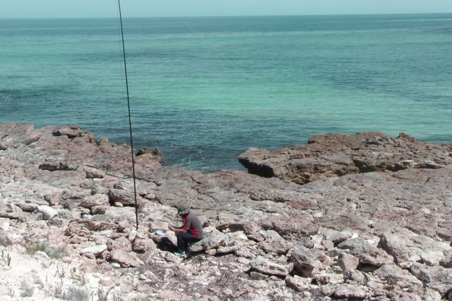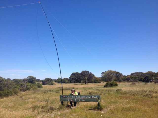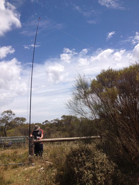There is a large carpark and camp ground area at the end of the road, and a path leading down to the beach. Well, in fact there is no beach. It is all rock. That’s how the park got its name. So I secured the squid pole between some rocks and stretched out the 40m/20m linked dipole. There were quite a few fisherman on the foreshore. I must have been the only guy using a squid pole for a different reason !