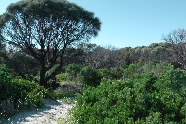 Leven Beach Conservation Park was proclaimed in 1988, and consists of 502 hectares of coastal dune system vegetation. Over 127 native species of plants have been recorded in park. There are various plants on the foredune aea including Coast Saltbush and Rolling Spinifex. Behind the foredune area is a diversity of species which form a low scrubland community with Coast Daisy-bush, Common Boobialla and Sea Box prominent. Further inland from the coast there are Drooping Sheoak, and Dryland Tea-tree woodlands with an understorey including Coast Daisy-bush and Coast Salt Bush. The Park has a 6 km beach frontage backed by low cliffs and a hinterland of undulating, vegetated dunes.