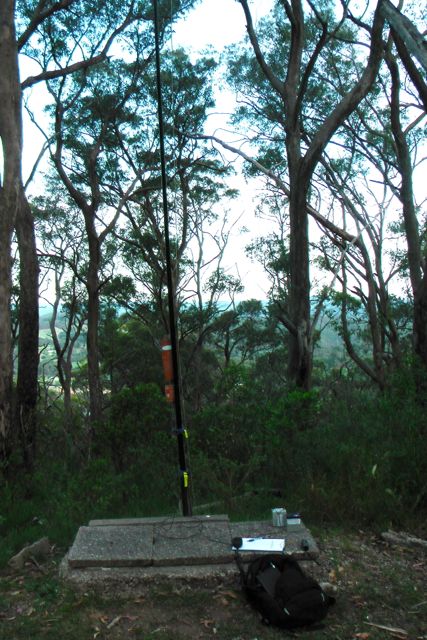 So I continued on my way to Mount Lofty, with some thoughts…..’should I do the summit, or join John for a nice cold beer‘. The summit activation won……..just ! Upon reaching the summit I set up on the eastern side of the main car park, amongst the scrub. I had operated from this exact spot during my 2nd Mt Lofty activation in May, 2013. It is a bit more of a secluded position, away from all the tourists and lovers enjoying the view of Adelaide near the obelisk. It is an excellent take off point out to the east, through the trees. I found a Telstra cable sign which was ideal to attach the 7m squid pole to with some octopus straps.