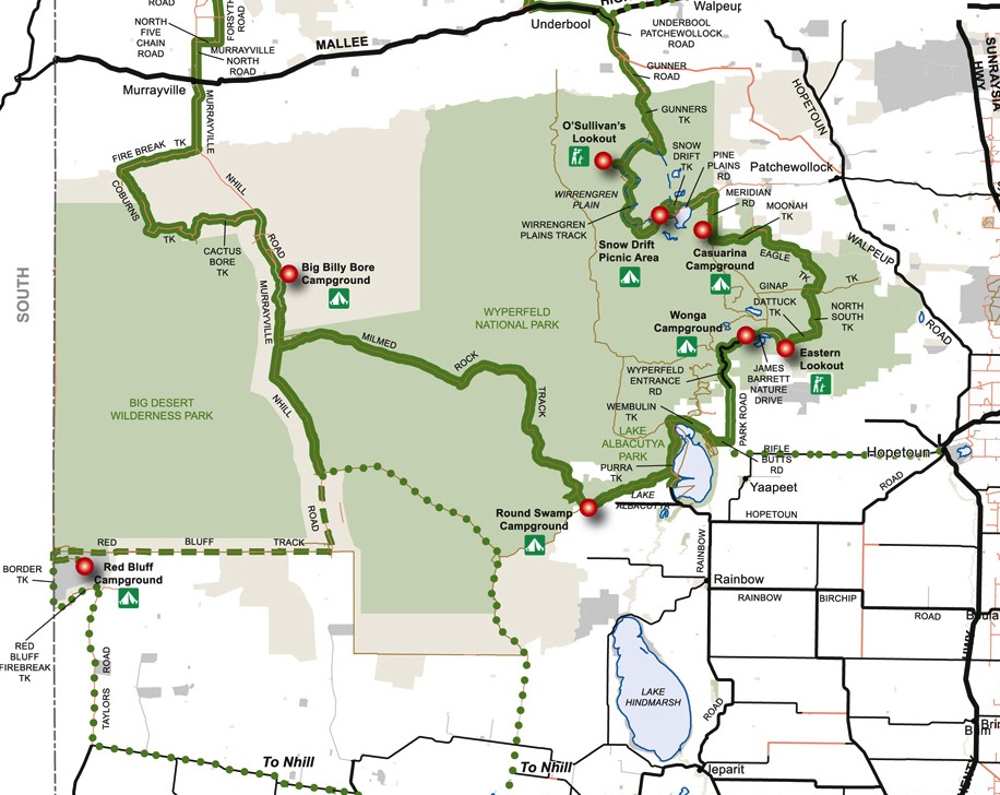 Wyperfeld National Park is the third largest National Park in Victoria and covers an area of 3,570.17 km². It was declared in 1921, and has been significantly expanded since that time to protect a huge area of mallee, woodland, and heartland in the north west of Victoria.