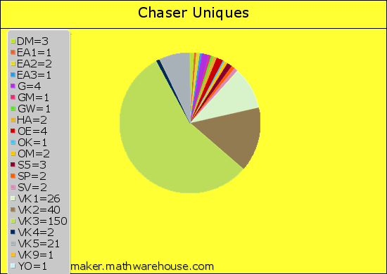 Propagation between here and the VK1 & VK2 SOTA activators has been very poor for a long time now.  Twelve months ago I was guaranteed of getting a contact with the VK1 fellas on 40m, even in the middle of the day.  Sadly that isn’t the case anymore, and there are sonly a handful of SOTA activators that try 20m.  So I decided to analyse the breakdown of my uniques.  Below is a chart with the results.  It clearly shows that the Victorian SOTA Activators take the biggest slice of the pie for me as a Chaser.  This is followed by VK2 and then VK1.