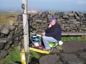 Because the weather was ordinary, we quickly erected the tent and antenna, my 40m/20m linked dipole, supported on a 7 metre squid pole (inverted v). I then walked a further 50 metres up to the trig point and admired the view for a short time, while I could. There is a trig point at the top, along with a directional cairn which was erected by the local council way back in 1966, the year after my birth.