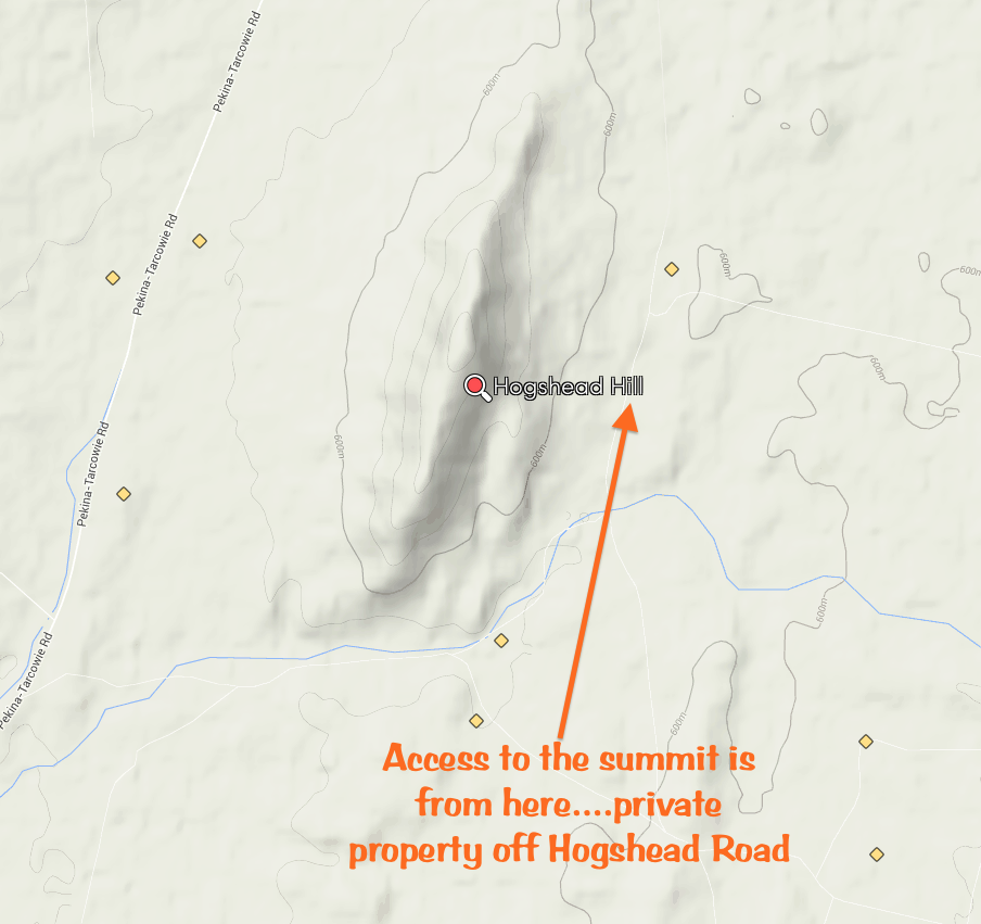 I accessed the summit via Hogshead Road. I had spoken to the land owner prior to access, and it appears that last time, Ian and I accessed the summit via his neighbour’s land. Fortunately there was no problem with us doing this, but this time I made sure I had very good directions regarding access. This time I parked my car on Hogshead Road, opposite a farmhouse on the eastern side of Hogshead Road. Directly opposite the farmhouse is a ‘cocky’s gate’. This is where I entered, following the scrub lined creek, up to a 2nd gate and fence line. As it turns out, there is a track leading through this paddock following the creek line which could be negated with care by a 2wd vehicle. However, I decided to leave my Falcon parked on Hogshead Road. At a recent service of my car, the mechanic had asked if I had gone off road, as there was a large build up of dirt under the car, along with some damage to the undercarriage.