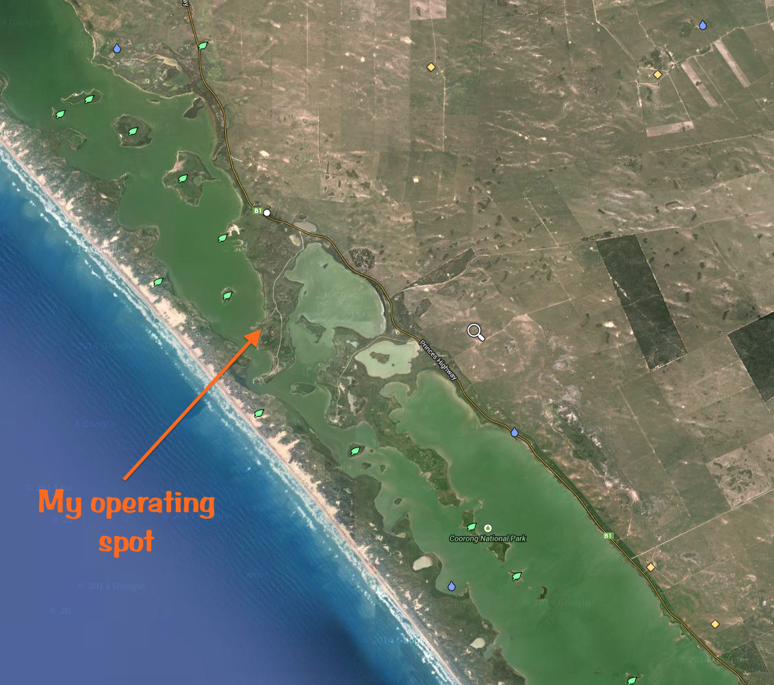 I left home and travelled a total distance of about 150 km to reach my operating spot, which was at Parnka Point in The Coorong NP.  I travelled east along the South Eastern Freeway, passed Murray Bridge and into the town of Tailem Bend which runs alongside the mighty River Murray.  From there I travelled south along the Princes Highway and on to the picturesque town of Meningie, which is located on the shores of Lake Albert.  I continued south east out of Meningie along the Princes Highway and then turned right into Parnka Point Road.  I then travelled the 3 km down the Prank Point Road, to the narrowest point of the Coorong NP.  The area is referred to as ‘Hells Gate’.