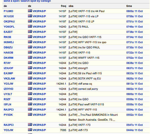 Thanks to the Australian stations that placed me on the parksnpeaks site.  And thanks to the following stations for placing me on the DX cluster, which kept the DX rolling in on 20m.
