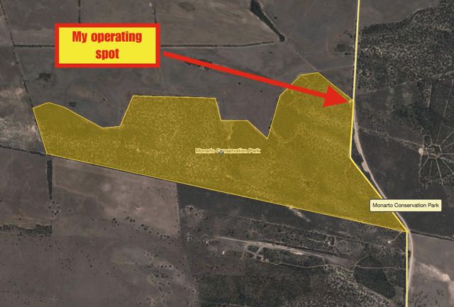 Late yesterday afternoon (Friday 30th January 2015) I ventured up to the Monarto Conservation Park (CP) for the second Summer afternoon/evening activation event for the VK5 National and Conservation Parks Award. I have activated Monarto a number of times previously, but it is close to home, just 30 km east of my home qth in the Adelaide Hills. So access time to the park is good. And it is a great park for night time activation, as there is a good carpark off the road, and some good options for setting up a table and chairs and stretching out the dipole.