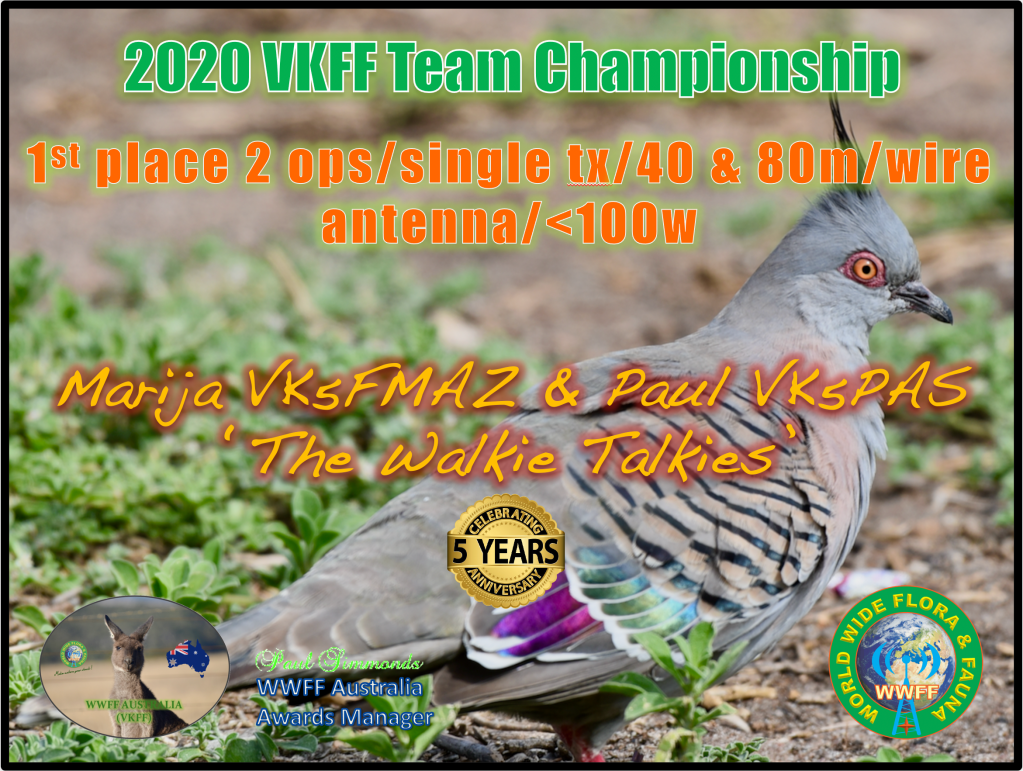 The 2020 VKFF Team Championship was held on Saturday 24th October 2020. Marija and I activated two parks, the Tolderol Game Reserve VKFF-1752 and the Ferries McDonald Conservation Park VKFF-0881.