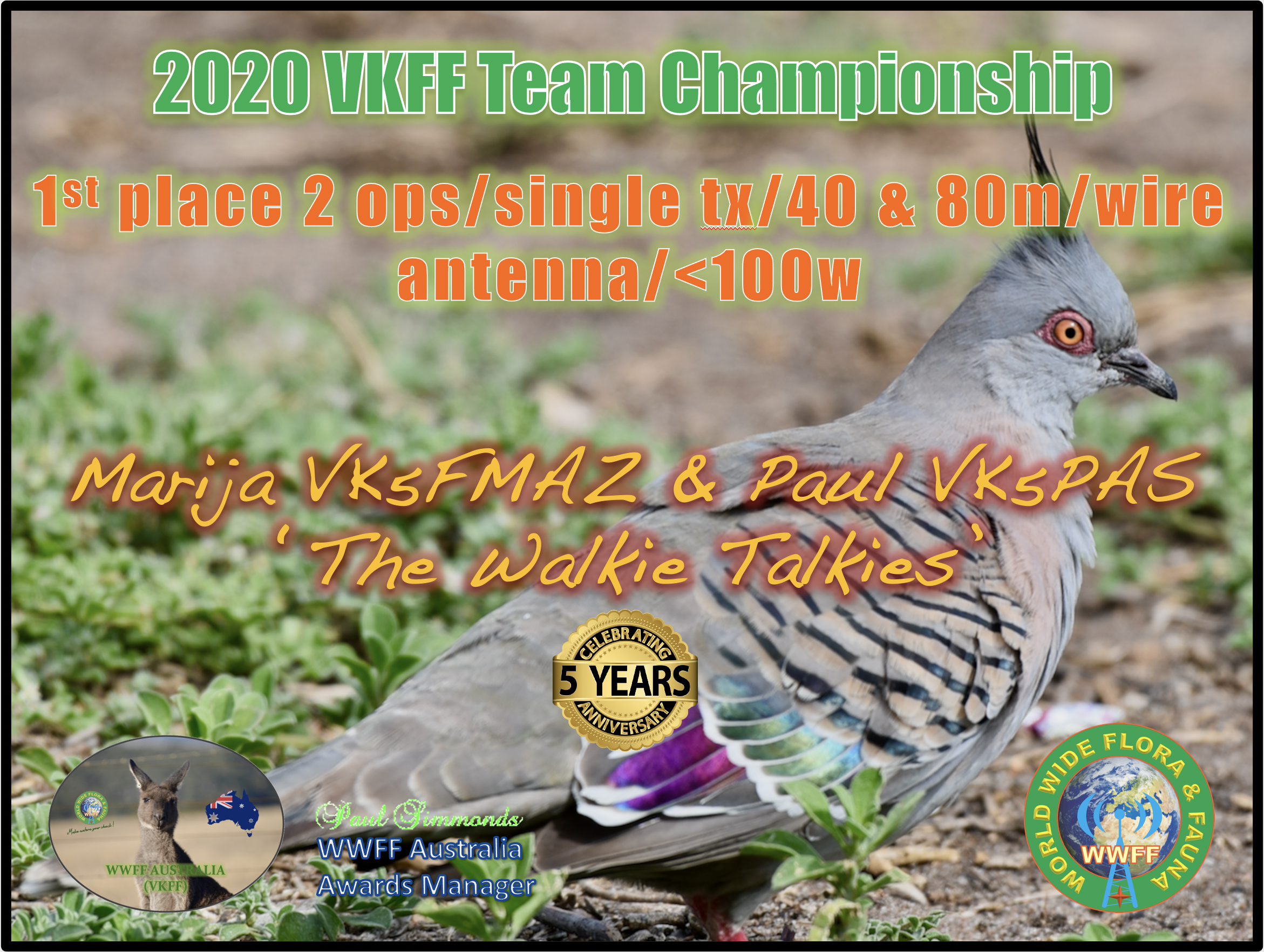 The 2020 VKFF Team Championship was held on Saturday 24th October 2020. Marija and I activated two parks, the Tolderol Game Reserve VKFF-1752 and the Ferries McDonald Conservation Park VKFF-0881.