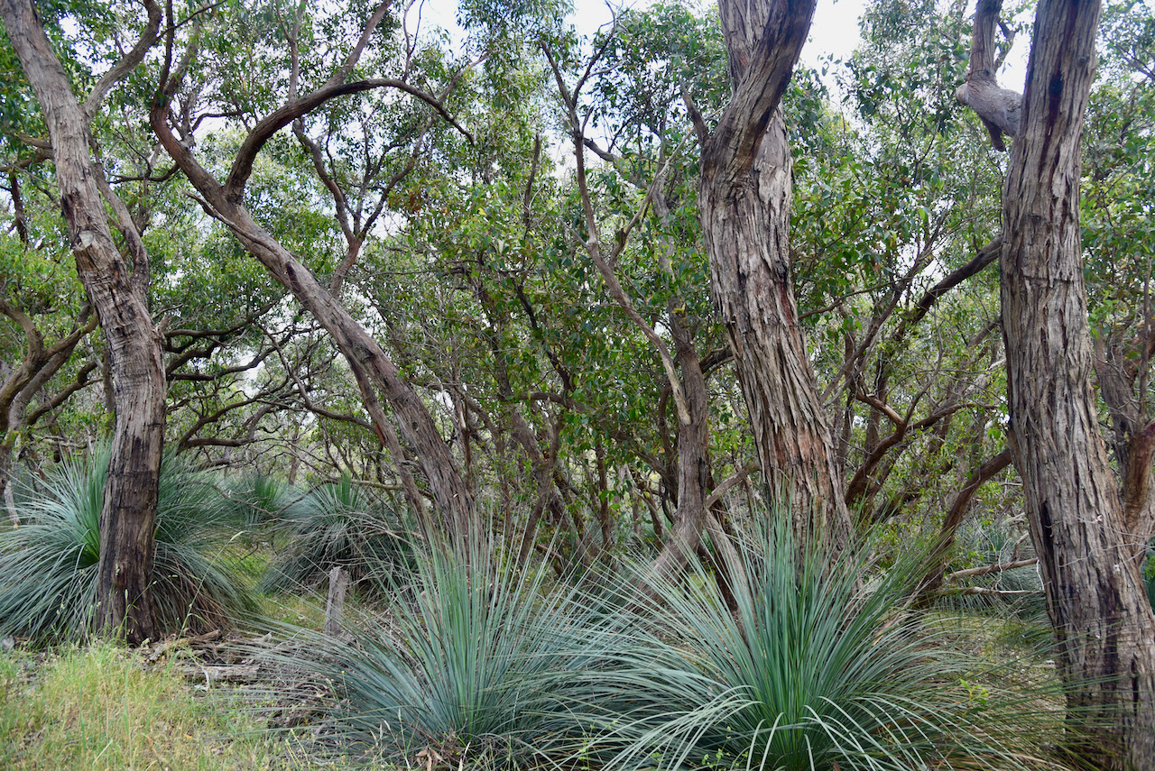 “hilly country heavily timbered with large stringybark and thick undergrowth of yaccas and ferns. The gullies were low tea tree swamp with light, sandy soils”.
