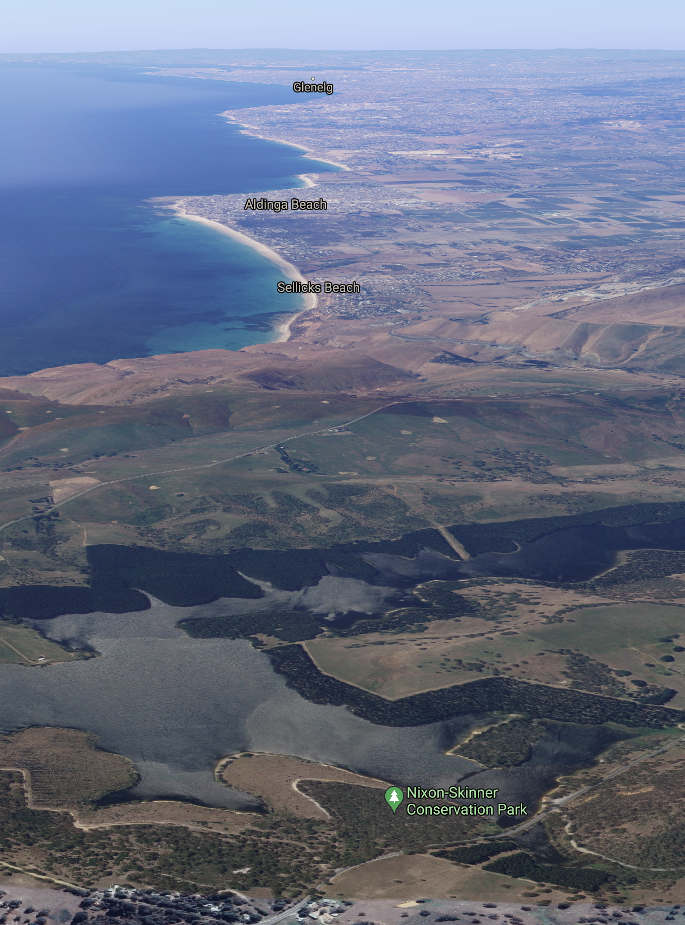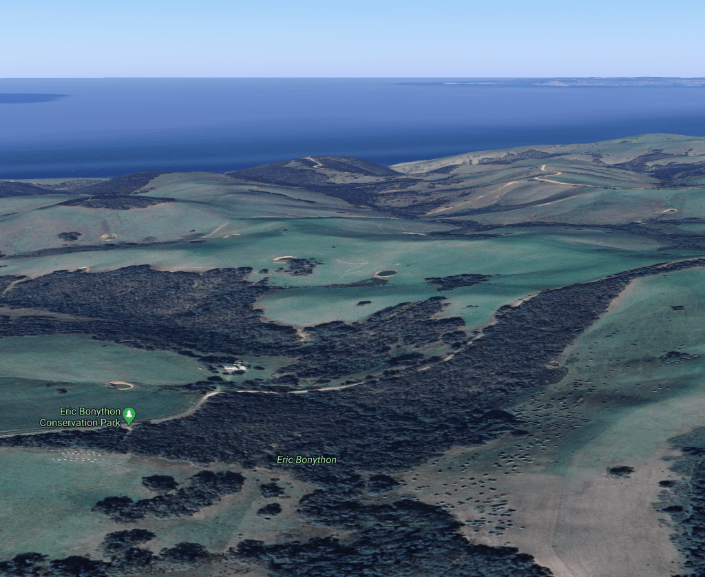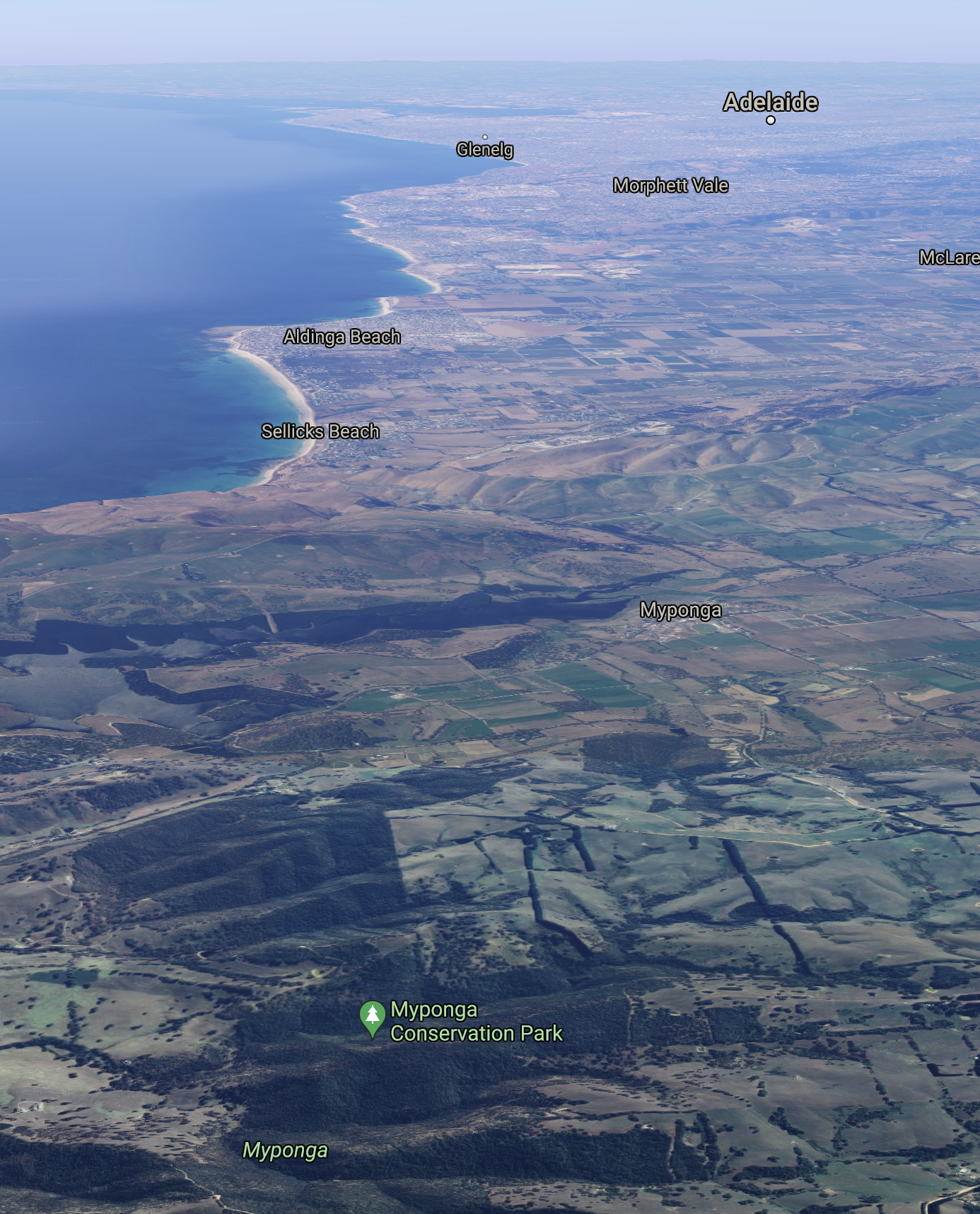 Above:- An aerial view of the Myponga Conservation Park, looking north back towards Adelaide. Image courtesy of Google maps