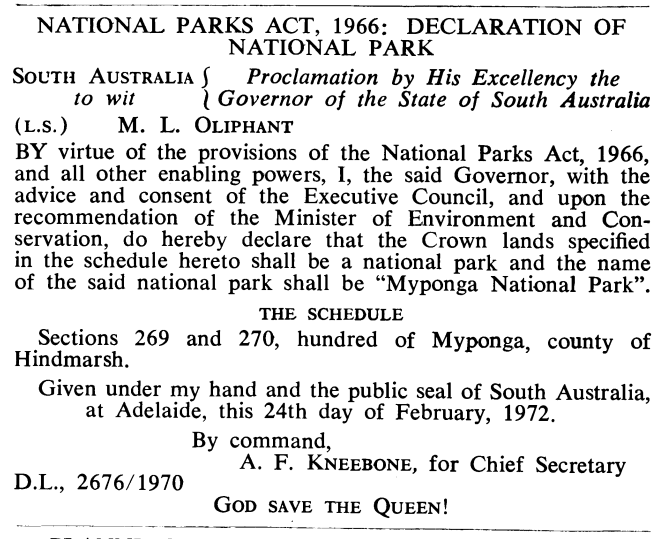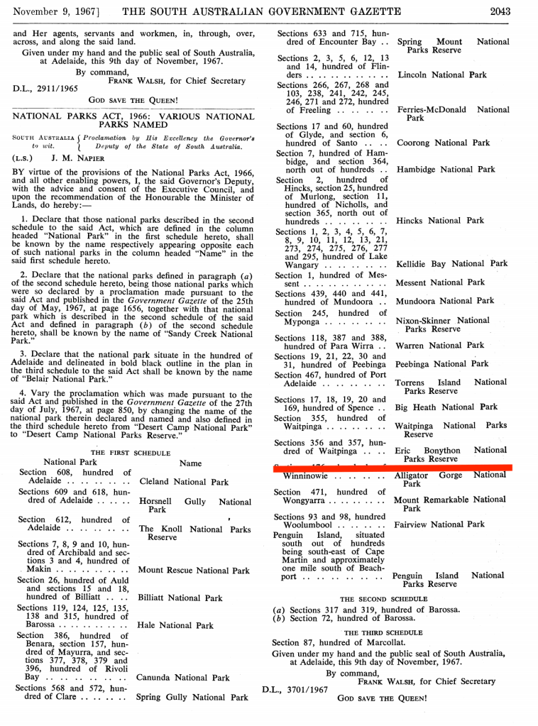 Above:- SA Govt Gazette re the Eric Bonython National Parks Reserve.
