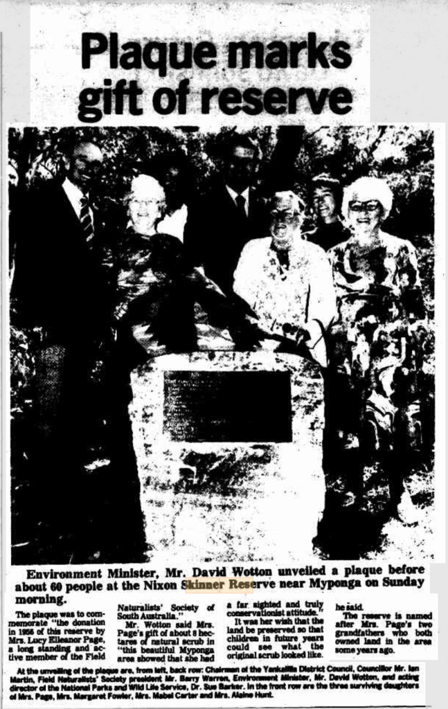 In 1980 a plaque was erected in the park by the Field Naturalists Society of South Australia Incorporated. The plaque was unveiled on the 24th day of February 1980, by the Hon. David Wotton, Esq, M.P. Minister of Environment. About 60 people were in attendance, including Mrs. Page’s three surviving daughters.