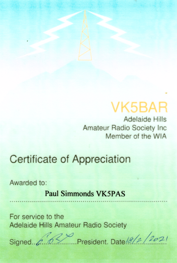 Last Thursday (18th February 2021) I attended the Annual General Meeting of the Adelaide Hills Amateur Radio Society (AHARS). At the end of the AGM proceedings I delivered a presentation on the AHARS website, of which I the Webmaster. I was also very pleased to receive a Certificate of Appreciation from the AHARS Committee for my service to AHARS.