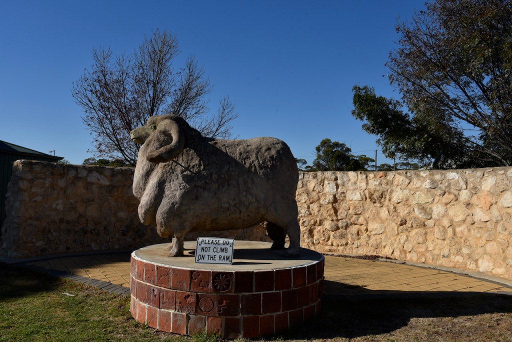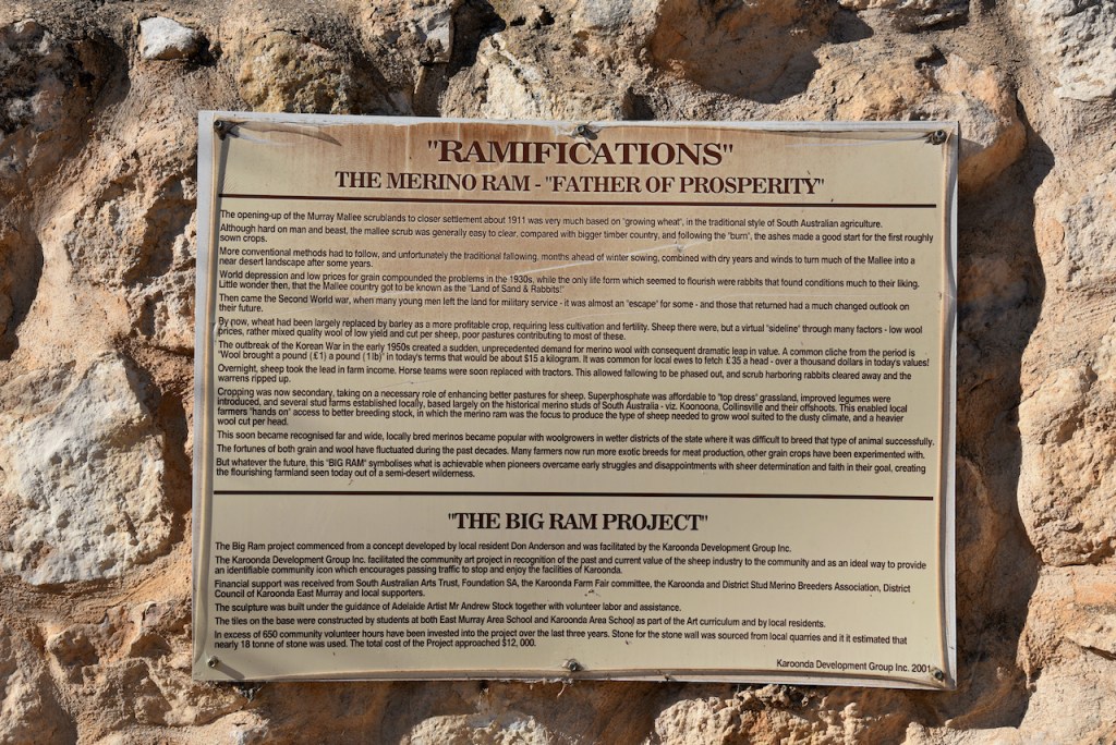Also in RSL Park is ‘Ramifications’, a statue of a Merino Ram, sometimes referred to as ‘The Big Ram’. The statue signifies the importance of sheep farming in the district. When the Murray-Mallee district was opened up to settlement during the early 1900’s, clearing of the mallee scrub commenced for the growing of wheat. By the 1930’s world depression and low prices for grain affected the wheat industry. At the commencement of the Second World War many of the local men left the land for military service. In the early 1950s with the outbreak of the Korean War, a sudden and unprecedented demand for Merino wool was created. As a result sheep became the lead in farm income in the region.